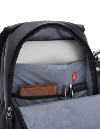 - Dedicated 14″ inch Laptop Compartment with cushioned cradle. Compartment also includes a detailed organizer.