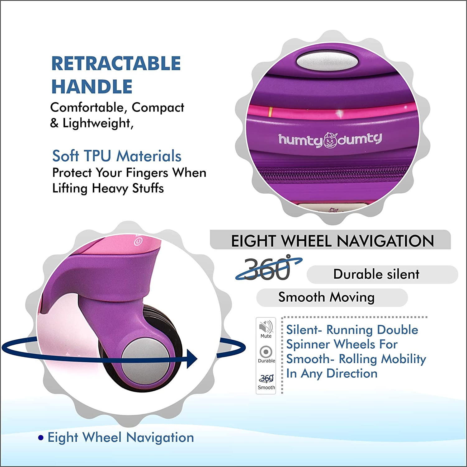 ROTATABLE WHEEL & CONVENIENT: The 8 wheels can turn 360 degrees and adjustable steel trolley with ABS Grip for easy handling, your children can easily push or pull the luggage, you don't need to worry about your kids' when they go camping.